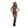 Patrón de encaje combinado y enterizo de malla con cuello tipo halter y entrepierna abierta. La tela suave súper elástica se ajustará desde la talla XS hasta la talla XL.
