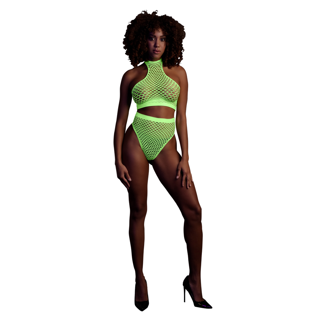 Our Neon lingerie is the perfect addition to your collection. Made with comfortable, easytofit, stretchy materials they are designed to fit your body perfectly. Whether you're using them as party wear or as lingerie, this eye-catching piece will make sure you stand out! Unleash your inner goddess with this stunning UV activated lingerie. This piece consist of a turtle neck crop top and high waist panty. An amazing party-wear that gives you that wow-factor and makes you stand out. The UV activated materials adds a touch of mystery and allure. Easy to fit because of the stretchy materials will make you light up the night. Available in neon pink and neon green. Sizes run from XS/ XL to XL/XXXXL