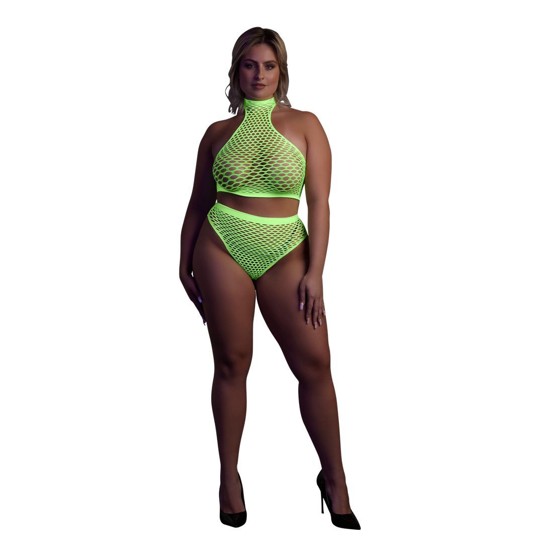 Our Neon lingerie is the perfect addition to your collection. Made with comfortable, easytofit, stretchy materials they are designed to fit your body perfectly. Whether you're using them as party wear or as lingerie, this eye-catching piece will make sure you stand out! Unleash your inner goddess with this stunning UV activated lingerie. This piece consist of a turtle neck crop top and high waist panty. An amazing party-wear that gives you that wow-factor and makes you stand out. The UV activated materials adds a touch of mystery and allure. Easy to fit because of the stretchy materials will make you light up the night. Available in neon pink and neon green. Sizes run from XS/ XL to XL/XXXXL
