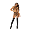 Conjunto de bralette de red elástica de 3 piezas, cinturilla, y tanga con detalles de cadena negra. Bralette tipo halter tiene detalle de cadena y ojal con cierre de gancho y bucle y banda elástica ajustable. Cinturilla tiene ligas frontales de cadena y cinturilla trasera elástica ajustable. Tanga a juego con detalle de cadena. Medias no incluidas.