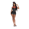 De la colección Dress Up de Magic Silk, este estilo incluye: un vestido negro con cuello halter que presenta cortes laterales y en la parte posterior, cuellos rojos y una diadema a juego en negro y rojo.