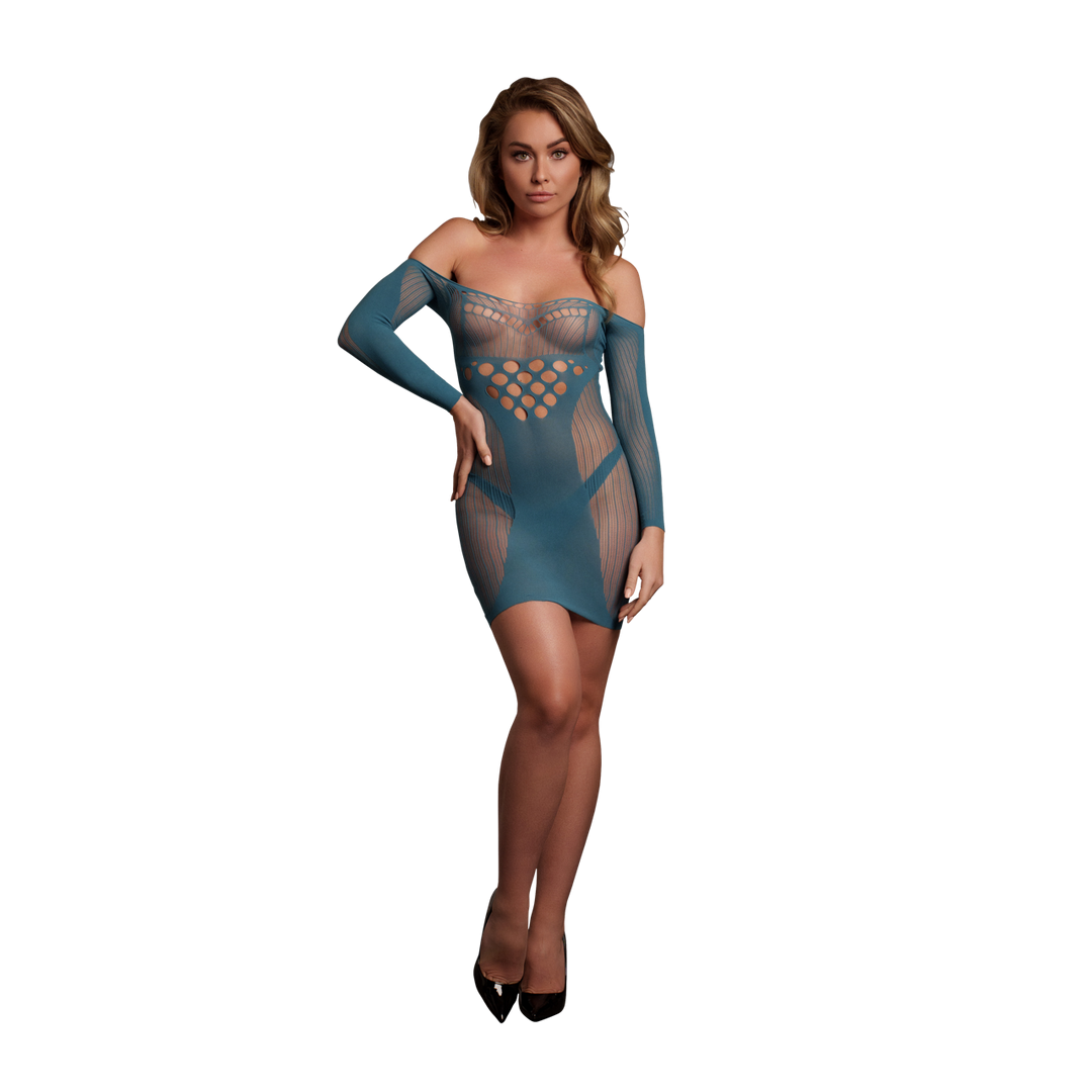 Mini vestido de manga larga de red con diseños circulares recortados debajo del busto. El diseño frontal opaco contrastante acentuará la forma del cuerpo. La tela suave súper elástica se ajustará desde la talla XL hasta la talla 4XL.