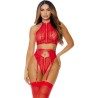 Conjunto de lencería de malla de 3 piezas que incluye un sujetador largo con cremallera en la parte delantera y detalle de corazón aterciopelado, acompañado de un cinturón de ligas y una braguita a juego.