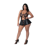 De la colección Lust Fetish de Magic Silk, este estilo incluye: una falda de tirantes con abertura en la entrepierna y un sujetador con aros de soporte para realzar y dar forma, anillos y tachuelas de metal niquelado, un panty con abertura en la entrepierna completa el atrevido look. Fabricado con malla de diamante de poliéster elástico y spandex y cire para un acabado brillante de imitación cuero.