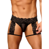 De la colección Scandal-Lace de Male Power, este estilo incluye: un short de liguero con un bolsillo de malla con ribete de cire y una ancha cinturilla de encaje floral con ligas a juego, unidas a orificios para las piernas de elástico suave y una parte trasera tipo g-string.